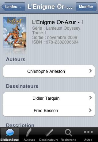 BDessinee vous permettra de vous rappeler à tout moment la composition de votre collection. Vous pourrez saisir plusieurs informations et constituer ainsi votre bilbiothèque sur votre iPhone ou iPad.